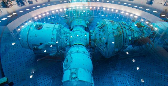 - مجمع مائي لمحاكاة انعدام الوزن يستخدم لتدريبات المشي في الفضاء وتحوي على وحدة محطة فضائية تزن 20 طناً.