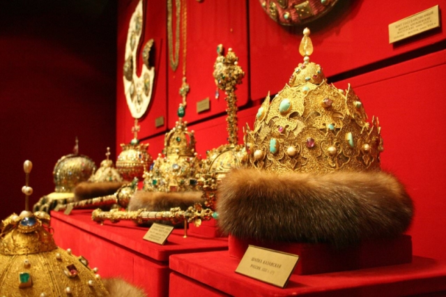 1.قاعة الملابس القياصرة الثمينة :يُعرض فيها مجموعة من ملابس خاصة بتتويج القياصرة على العرش، والتى كانت تُصنع من الحرير وتُطرز، وفساتين زوجاتهم ذات الأقمشة الثمينة التى إرتدوها فى هذه المناسبة الإحتفالية ، بالإضافة إلى مجموعة من الصاكوص”رداء البابا الروسي ” منذالعصور الوسطى وحتى القرن ال 19 .
