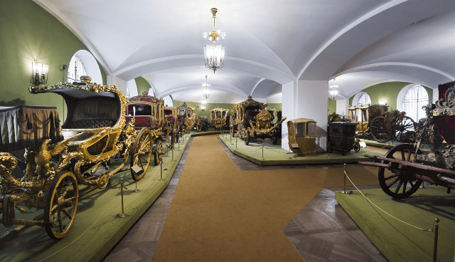 4.قاعة عربات القياصرة: هذه القاعة مخصصة لعربات تجرها الخيول 17 عربة خاصة بالقياصرة في القرنين السادس عشر- الثامن عشر، تم استخدامها فى مواكب التتويج و خلال أهم احتفالات الدولة ، والمصنعة من أغلى الأخشاب و أرقى الأقمشة وفوق كل عربة يوجد تاج العرش الروسي ،قام بتصنيعها وزخرفتها أساتذة من أكبر المراكز الفنية في روسيا وأوروبا الغربية، موسكو وسانت بطرسبرج ،وفيينا ،وبرلين ،وباريس، ولندن