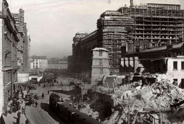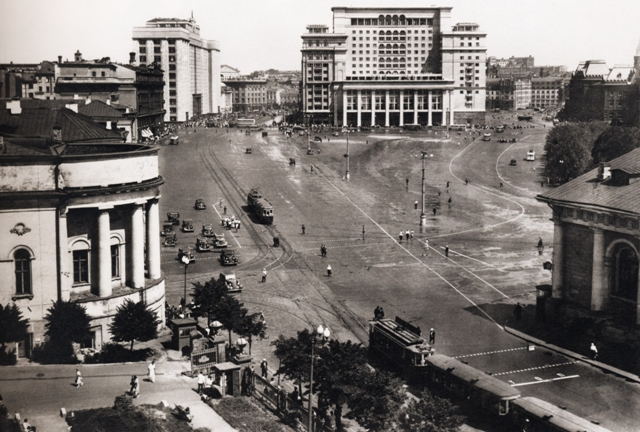 مع بداية حفر المترو في 1932-1938 ، تم هدم المباني في الممرات، وسمي “ميدان مانيجنايا” ، و في عام 1967 أعيدت تسميته تكريما للذكرى الخمسين لثورة أكتوبر ، وأصبح يعرف باسم “ميدان الذكرى الخمسين لأكتوبر”،و على الجانب الآخر من جانب مانيج تم إفتتاح فندق موسكو ” عام 1935، “فور سيزون حالياً.”