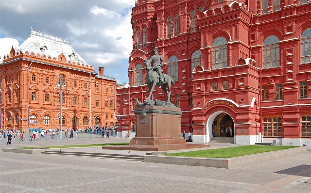 في عام 1995 وبالقرب من ميدان مانيجنايا تم وضع نصب تذكاري للمارشال جوكوف ،المارشال جوكوف هو الوحيد الذي إشترك فى عرضًا عسكريًا على حصان أبيض خلال الحقبة السوفيتية وشارك فى موكب النصر الذي أقيم في 24 يونيو 1945، يصور تمثال جوكوف على ظهر حصان حربي يسحق النازية المهزومة بحوافره،وبدا الفارس وكأنه يقف في الركب يحيي رفاقه في السلاح ، (التمثال مصنوع من البرونز ، والقاعدة مصنوعة من الجرانيت)، ويصل الوزن الإجمالي للنصب التذكاري حوالي 100 طن