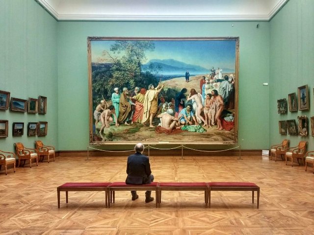 يقوم المرشدون المحترفون بإخباروشرح تاريخ إنشاء اللوحات الفنية للسائحين ،وإلقاء الضوء على تاريخ ومراحل تطور الفن الروسي ، وروائع الرسم في القرنين الثامن عشر والتاسع عشر ، وأعمال الفنانين المتجولين والروسية الطليعية، وأيضاً أيقونات روس القديمة.
